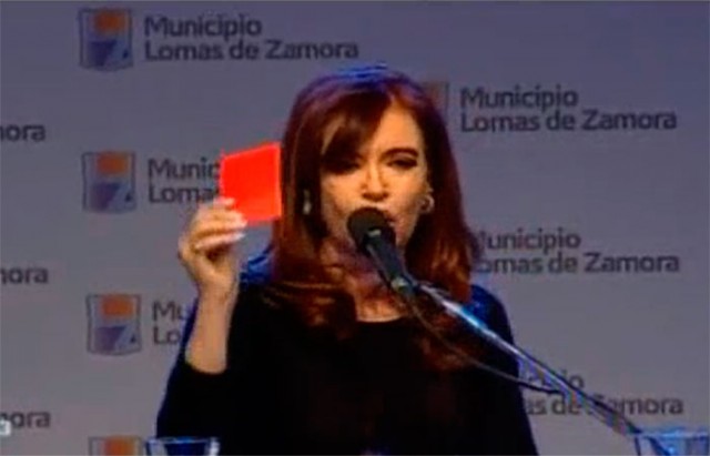 La presidenta Cristina Fernández de Kirchner solicitó hoy en Lomas de Zamora a «sacarles tarjeta roja a los que les pegan a las mujeres, física o moralmente» y a «todos aquellos que no quieren a su prójimo», al inaugurar un centro para víctimas de la violencia de género. Además, se refirió a los graves enfrentamientos entre barras de Boca