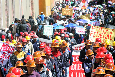 «Potosí federal, Potosí federal», fue el estribillo más escuchado durante la masiva marcha de al menos unas 5.000 personas que recorrieron las principales calles de esa ciudad y terminaron en un mitin en plaza 10 de Noviembre. Los potosinos se movilizaron ayer en rechazo a la pérdida de un escaño en la Cámara de Diputados y en protesta contra el Gobierno Nacional por no haber cumplido la ejecución de obras y proyectos productivos en ese departamento.