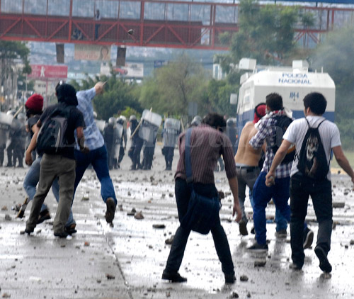 El enfrentamiento continuó y los policías seguían lanzándoles bombas y los estudiantes repeliéndolos con piedras, acción que se extendió hasta pasadas las 4:00 de la tarde, cuando los manifestantes se agruparon en el interior de la UNAH.