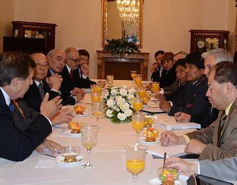 «Me recomiendan no levantar la demanda ante La Haya. El diálogo siempre estará abierto bajo la propuesta o iniciativa de organizaciones, especialmente del nuevo Gobierno de Chile”, comunicó el presidente Morales en conferencia de prensa, tras reunirse con los excancilleres y otras personalidades desde las 7:00 de ayer en el Palacio.