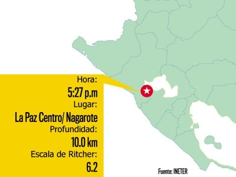 Un terremoto cuya magnitud fue establecida preliminarmente en 6.2 grados Richter sacudió a las 5:27 de la tarde el territorio nacional, informaron las autoridades. El mandatario nicaragüense, Daniel Ortega ha declarado la alerta amarilla ante la emergencia.
