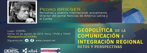 El miércoles 20 de agosto, a las 17h00, el Centro Internacional de Estudios Superiores de Comunicación para América Latina (CIESPAL), la Agencia Latinoamericana de Comunicación (ALAI) y el Foro de Comunicación para la Integración de NuestrAmérica; organizan el conversatorio Geopolítica de la comunicación e integración regional: retos y perspectivas. Este será un espacio de discusión e intercambio entre los participantes sobre la realidad comunicacional de los países de la región.