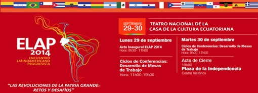 El próximo lunes 29 y martes 30 de septiembre se desarrollará en la ciudad capital el Encuentro Latinoamericano Progresista (ELAP) 2014, el cual será un espacio de interlocución entre las principales figuras de la izquierda latinoamericana y de organizaciones políticas afines al Gobierno de la Revolución Ciudadana.