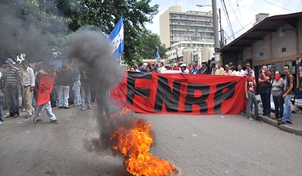 Con tomas de varias calles y quema de llantas protestaron el miercoles miembros del Frente Nacional de Resistencia Popular (FNRP), en la capital para exigir al Gobierno el cese a la impunidad y la corrupción en el país.