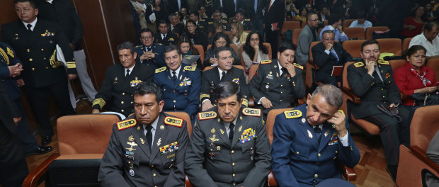 En las afueras de la CNJ se apostaron militares en servicio pasivo que portaban pancartas y gritaban consignas señalando, entre otros, que “las Fuerzas Armadas no son terroristas”, en tanto que la cúpula de Fuerzas Armadas estuvo presente en la sala donde se tenía previsto que inicie la audiencia pública.