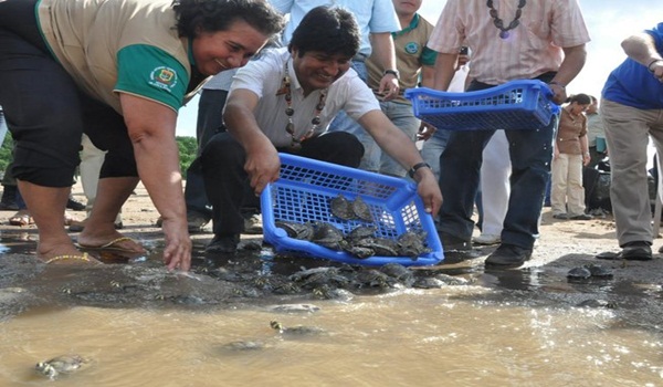 En el marco del cuidado de la fauna silvestre boliviana, el presidente Evo Morales liberó cien mil crías de tortugas en el río Iténez, ubicado en el noreste amazónico del país, Beni.