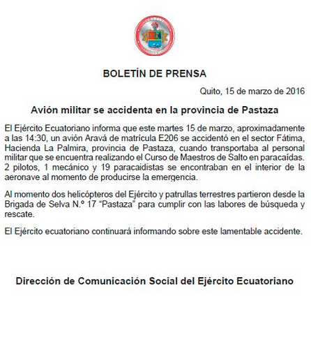 Un avión Aravá de matrícula E206 (AEE206) se accidentó en el sector de Fátima, en la Hacienda La Palmira (Pastaza). El Ejército Ecuatoriano informó que la tragedia se produjo alrededor de las 14:30 de este martes 15 de marzo.