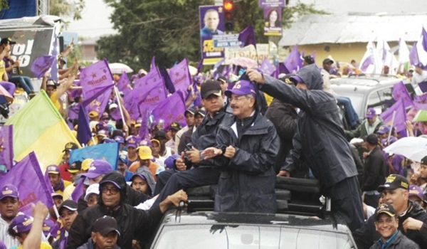 Desde las casas, azoteas, calles y balcones el candidato presidencial del PLD y organizaciones aliadas recibía muestras de apoyo de seguidores y simpatizantes que enarbolaban afiches, banderas, banderolas y trozos de tela con los colores característicos de las organizaciones políticas que apoyan a los candidatos peledeístas y aliados.