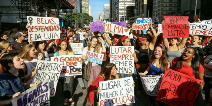 «A primeira mulher presidente voltará a governar, e será pela mãos das mulheres. Portanto, Dilma muita força, não sairemos da rua sem colocar para fora Michel Temer», gritaram, em jogral, as mulheres que foram às ruas neste domingo, contra o presidente interino Michel Temer, em São Paulo; os organizadores calcularam em 10 mil o número de manifestantes.