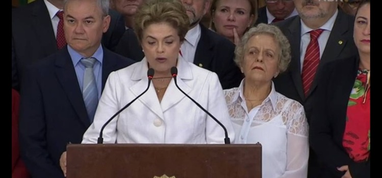 A presidente Dilma Rousseff se pronunciou na manhã desta quinta-feira (12), em Brasília (DF), após ser notificada pela decisão do Senado Federal de aprovar o impeachment de seu mandato. Emocionada, a presidenta disse que a ação é um «golpe» contra a democracia no Brasil e que lutará pelo seu mandato. «A luta pela democracia não tem data para terminar, é permanente», disse.