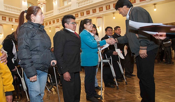 El Gobierno comenzó ayer con la entrega de memorándums de designación e incorporación de personas con discapacidad a instituciones y empresas públicas, en el marco del inicio del Plan Nacional de Inserción Social. 500 personas serán capacitadas durante seis meses en entidades públicas percibiendo un salario de 1.805 bolivianos; luego podrán pasar a formar parte del personal de planta.