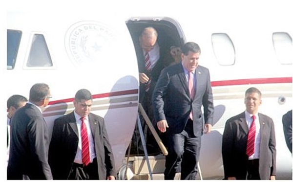 Acompaña a Cartes una frondosa delegación compuesta por el canciller Eladio Loizaga; el asesor jurídico Sergio Godoy; el ministro Gustavo Leite (Industria y Comercio); Darío Filártiga (asesor político); y Arnaldo Franco (secretario privado). Dos senadores oficialistas fueron elegidos esta vez por el mandatario para integrar la comitiva y son Luis Alberto Castiglioni y Gustavo Alfonso. Además está un edecán militar, el jefe de seguridad militar, mayor Daniel Falcón, y responsables de protocolo presidencial.
