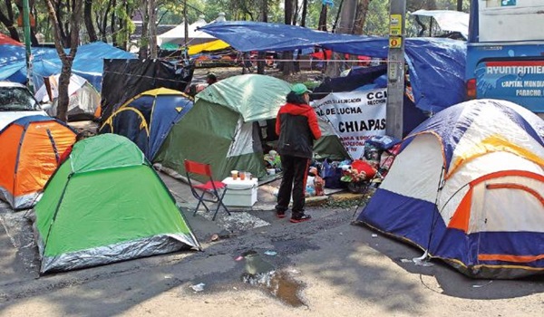 Los profesores se mantienen en el plantón, como Juan, de la región de Apatzingán, Michoacán, quien ayer cumplió 15 días de permanecer en el campamento. Dijo que forma parte del equipo que se encarga de la cocina y el comedor comunitario. Ahí reúne víveres y con sus compañeras prepara desayunos, comidas y cenas. Además, administra una regadera localizada en la misma carpa que la cocina de los que vienen de Apatzingán.