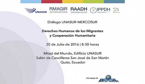 La Reunión de Ministros y Altas Autoridades de Gestión Integral de Riesgos de Desastres (RMAGIR), la Reunión de Altas Autoridades de Derechos Humanos (RAADH) y el Instituto de Políticas Públicas en Derechos Humanos del MERCOSUR (IPPDH) tienen el honor de invitarlos al “Diálogo UNASUR-MERCOSUR sobre Derechos Humanos de los Migrantes y Cooperación Humanitaria”.