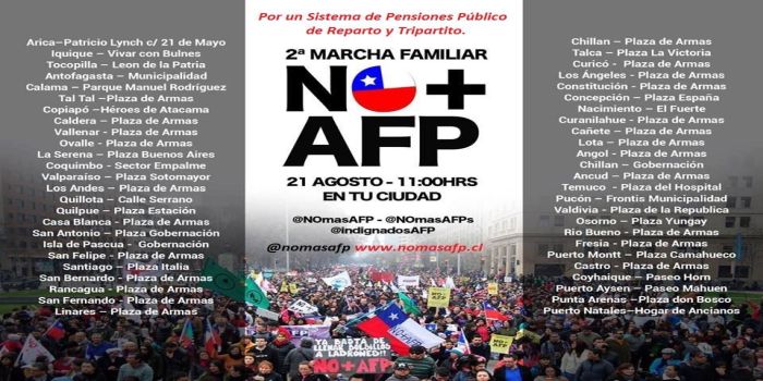 En todas las regiones del país se convoca a participar a la Segunda Marcha Familiar No+AFP, el domingo 21 de agosto a las 11 hrs. La marcha se encuentra autorizada por las autoridades.