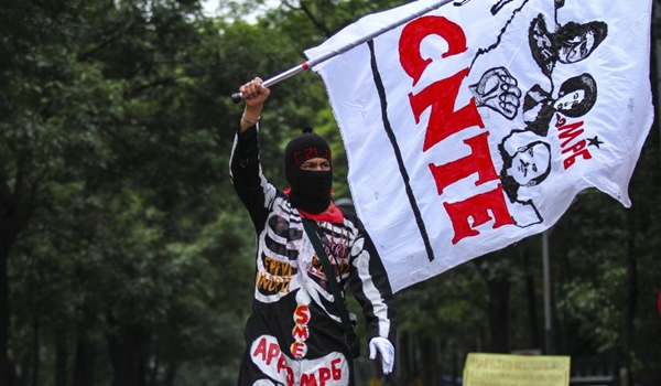 Ayer, maestros disidentes marcharon desde las inmediaciones de Los Pinos para arribar por segunda ocasión en menos de una semana al Zócalo capitalino. Ahí, Enríquez Ibarra destacó que la advertencia del sector empresarial de que presentará en ceros sus declaraciones de impuestos es una ‘‘amenaza, porque en realidad lo que ellos desean es no tener pérdidas en sus ganancias. Habría que recordarles que también han sido beneficiados por créditos fiscales’’.