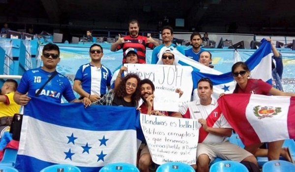Hondureños que participan del encuentro mundial de disciplinas deportivas aprovecharon el partido entre la selección olímpica de Honduras y la de Portugal para llevar sus pancartas al estadio Engenhao o Joao Avelange ,pidiendo la renuncia del mandatario hondureño Juan Hernández, con sus pancartas de “Fuera JOH”.
