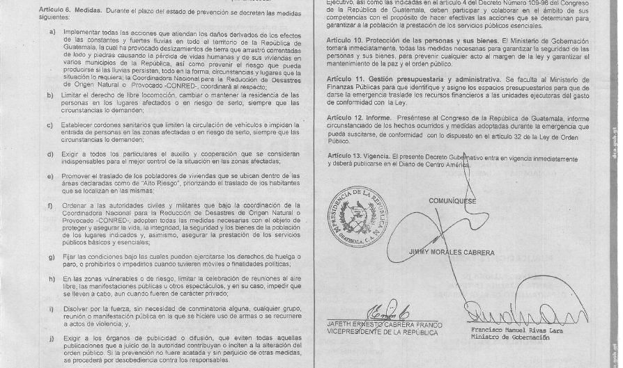 El Estado de Prevención decretado por el presidente Jimmy Morales por un plazo de quince días, también restringe las manifestaciones con carácter político y se pide evitar publicaciones que inciten a la alteración del orden público, según se lee en los incisos g y j del artículo seis que establece las medidas del acuerdo.