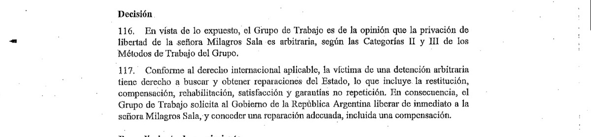 El Grupo de Trabajo sobre la detención arbitraria de Naciones Unidas decidió que «la detención de la señora Milagro Sala es arbitraria» y en consecuencia solicitó «al gobierno de la República Argentina liberarla de inmediato».