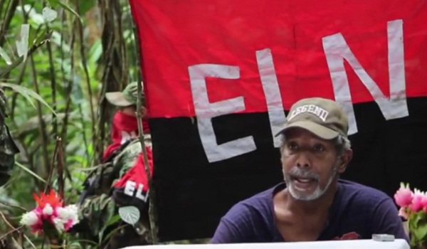 En la grabación se observa en varios momentos la presencia de guerrilleros armados luciendo banderas alusivas al ELN, mientras Odín Sánchez está sentando vistiendo buzo azul, sudadera y gorra de color café.