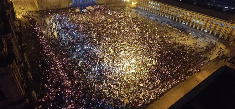 En la capital estudiantes de 26 universidades se movilizaron desde el Planetario Distrital y otros puntos rumbo a la Plaza de Bolívar. En el camino, por la carrera séptima, llevaban banderas blancas y de Colombia y la comunidad marchó vestida de blanco cargando velones.