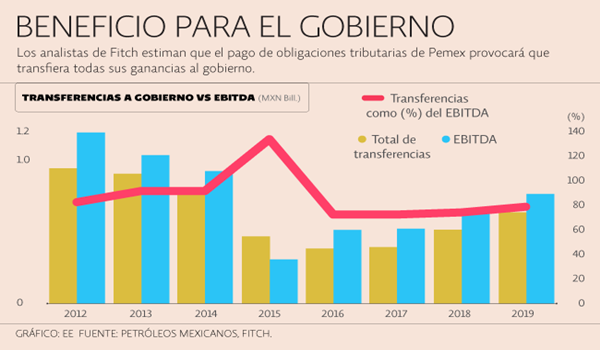 En el informe, los analistas de Fitch estiman que los pagos de obligaciones tributarias de Pemex provocarán que transfiera todo su beneficio bruto al gobierno, el EBITDA, en este año, pues considera “improbable que la compañía genere un flujo de fondos libre en el futuro previsible”.