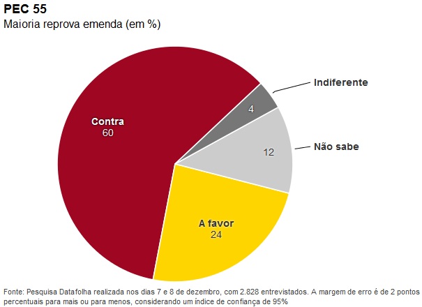 Segundo o instituto, que entrevistou 2.828 pessoas em 7 e 8 de dezembro, 60% dos brasileiros são contra a aprovação da emenda, que deve ser votada em segundo turno nesta terça (13) no Senado.