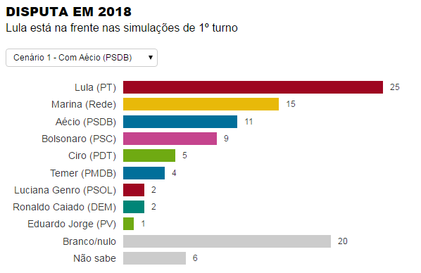 Em um cenário contra o senador Aécio Neves (PSDB-MG), Lula teria 25% das intenções de voto e o tucano, 11%. Com esse resultado, o mineiro fica atrás também da ex-senadora Marina Silva (Rede Sustentabilidade), que aparece com 15% das intenções.