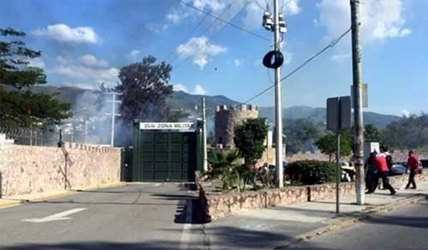 «¡Devuelvan a nuestros compañeros, ustedes saben dónde están!», gritaron los normalistas a los militares, mientras los padres exigían: «¡devuélvannos a nuestros hijos!» Al filo de las 14:50 horas, los inconformes lanzaron cocteles molotov que afectaron al menos tres vehículos que se hallaban en el interior del cuartel, cuyos medallones quedaron destrozados.