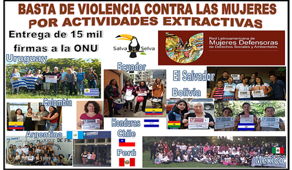 La entrega se hizo a la ONU en Ecuador, Argentina, Bolivia, Chile, México, Uruguay, Colombia, El Salvador, Honduras, Perú y próximamente serán entregadas en Panamá y en otros países. La campaña de firmas virtuales fue impulsada por la Red Latinoamericana de Mujeres Defensoras de Derechos Sociales y Ambientales en coordinación con Salva la Selva desde su sitio web www.salvalaselva.org con mucha interacción de personas de diferentes países, que al conocer los ejemplos de violencia contra las mujeres por actividades mineras se sumaron a la petición con una firma.