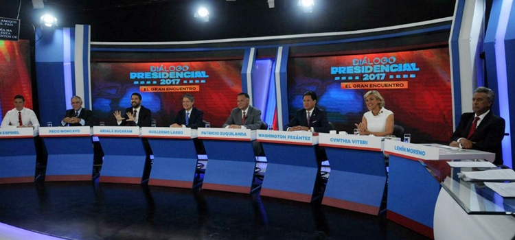 En un mismo escenario, en el denominado “Diálogo Presidencial 2017” organizado por diario El Comercio, siete de los ocho candidatos insistieron en desvirtuar la gestión del gobierno del presidente Rafael Correa, según ha sido la tónica de la campaña electoral, y presentaron sus ofertas sin profundizar sus planes de gobierno, cómo y con qué recursos materializarlas.