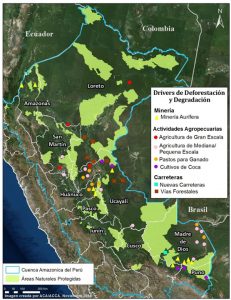 En datos provistos por el Proyecto de Monitoreo de la Amazonía Andina (MAAP), se indica que las principales causas de la pérdida de bosques son la tala, el avance de la agricultura de pequeña y mediana escala, pero también la de gran escala, la reconversión a tierras de pasturas para la ganadería, la minería ilegal, los cultivos de coca, y las obras de infraestructura, como las carreteras.