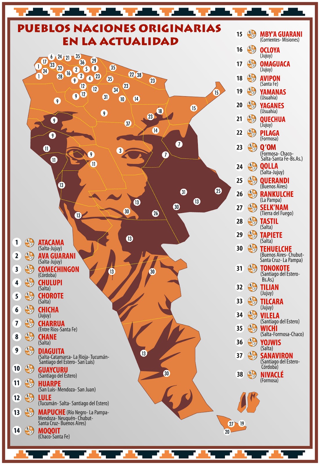 Entre los pueblos reconocidos por el Estado, están los Atacama, Ava Guaraní, Aymara, Comechingón, Chané, Charrúa, Chorote, Chulupí, Diaguita-Calchaquí, Guaraní, Huarpe, Kolla, Lule, Mapuche, Mbyá Guaraní, Mocoví, Omaguaca, Ocloya, Pampa, Pilagá, Rankulche, Quechua, Querandí, Sanavirón, Selknam (Onas), Tapiete, Tehuelche, Tilián, Qom, Tonocoté, Tupí Guaraní, Vilela y Wichí, entre otros. Al mismo tiempo, nuevas comunidades transitan el camino del autoreconocimiento y se identifican pueblos que la historia oficial negó durante siglos. Uno de ellos: los Nivaclé.