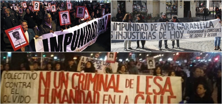 Los manifestantes, que respondieron al llamado efectuado por el Coordinador de Organizaciones Sociales y de Derechos Humanos, se desplazaron desde Plaza Italia hasta la céntrica Plaza de Armas exigiendo terminar con la impunidad para quienes cometieron delitos de lesa humanidad; con los beneficios para los criminales procesados (a quienes sus cercanos, el gobierno y la derecha pretenden mostrar como unos ‘pobrecitos’ y ‘enfermitos’ ancianos) y por la salida del Comandante en Jefe del Ejército, Humberto Oviedo, quien recientemente justificara las miles de ejecuciones, desapariciones y torturas de detenidos políticos posgolpe, con la excusa del “acatamiento de las órdenes”, pretendiendo así disculpar a cierta oficialidad que cometió tales atrocidades o bien mandó a otros a cometerlos.