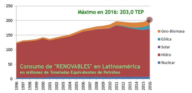 Las energías renovables siguen representando una esperanza para muchos. Los aumentos interanuales en capacidad instalada de energía eólica son impresionantes, especialmente en Chile (56,3%), Uruguay (43,2% aunque más sostenida en el tiempo) y Brasil (23,1%), pero acá hay que seguir teniendo en cuenta que en nuestro mix energético la electricidad está lejos de ser la principal demanda: petróleo para el transporte y, en menor medida, gas para calefacción se mantienen como poco reemplazables.