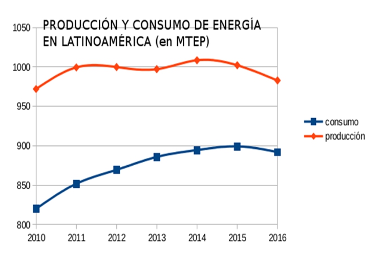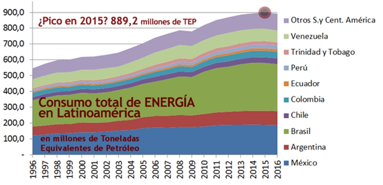 Por tercer año traemos nuestras observaciones sobre la energía en Latinoamérica y el Caribe aprovechando la salida del nuevo BP Statistical Review of World Energy [1]. Desde 2015 descubrimos y presentamos a nuestros lectores un problema al cual suponemos potencialmente catastrófico: “La región está abocada a una crisis energética. En poco tiempo llegaremos al pico del consumo; evento que estará asociado al agravamiento irreversible de la situación social” (TOC 2015). Hasta 2014 la situación era bastante estable, el crecimiento económico de la región aún no se había visto trastocado, sin embargo, a partir del siguiente gráfico, nos animamos a hacer un pronóstico: