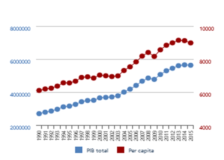 Existe una bien estudiada correlación directa entre el consumo de energía y el PIB total. Se puede comparar el gráfico de la CEPAL [6] para Latinoamérica y el Caribe con la línea que describe nuestro gráfico de consumo energético total.
