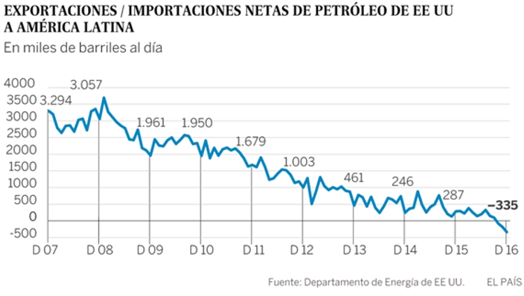 En 1971, el escritor uruguayo Eduardo Galeano se preguntaba: “¿Que sería del imperio sin el petróleo de América Latina?”. Hoy, 46 años después, el interrogante es a la inversa. La primera economía del mundo ya exporta mucho más derivados del oro negro de los que compra al sur de la frontera. El cambio se produjo en octubre de 2016, cuando el imperio registró un superávit comercial de más de 80.000 barriles diarios de hidrocarburos, que llegó a ampliarse en diciembre a más de 335.000 barriles, según las cifras de la Oficina de Información de Energía estadounidense (EIA).