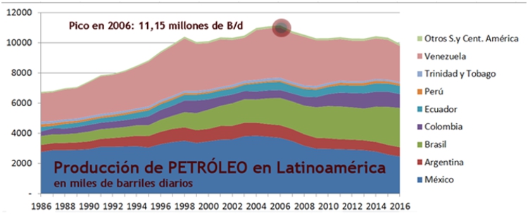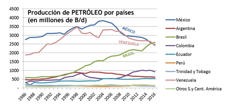 De los cinco principales productores de la región el único que crece es Brasil y no alcanza a compensar las caídas del resto. A las ya tradicionales caídas de México, Venezuela y Argentina, que rondan en algunos casos los diez años (anterior a la asunción de Chávez en el caso de la patria bolivariana), se sumó Colombia. Este país sale de su meseta ondulante y empieza una segunda etapa de declive. En Venezuela y Argentina se mezclan, como hemos dicho antes, factores geológicos, económicos y sociales, pero el resultado final es el mismo: caídas más o menos lentas son parcialmente compensadas por el crecimiento de Brasil, que pasa a convertirse en el mayor productor de la región.