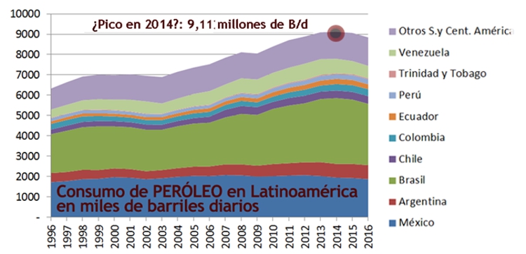 La región no tiene políticas ambientales que orienten a una descarbonización de la economía. Se puede ver en el vertiginoso aumento en el consumo de petróleo en la primer década y así entender que la incipiente caída actual tiene una relación directa con los límites y no con un proyecto ecosocial. Dos importantes países están pasando de ser exportadores netos a importadores (Argentina y México): el costo de no tener más crudo económicamente rentable, en el primer caso, o la incapacidad de aumentar la capacidad de refinería para la demanda interna en el segundo, obligan no sólo a dejar de ganar dinero sino a empezar a perderlo.
