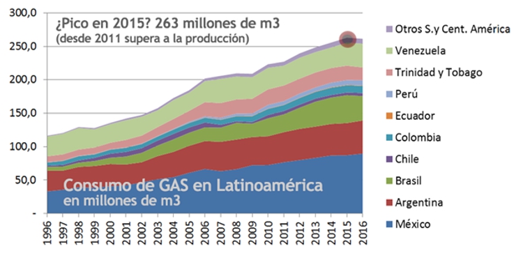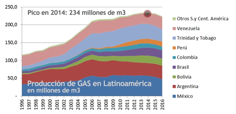 En el resto de países la extracción de gas siguió por los mismos caminos que la del petróleo: pocas perforaciones desde 2015, poca producción en 2016. Qué esperanzas habrá para 2017 si ya en 2016 el promedio de las plataformas de perforación activas (198) fueron menos de la mitad de las de 2014 (397) [5].