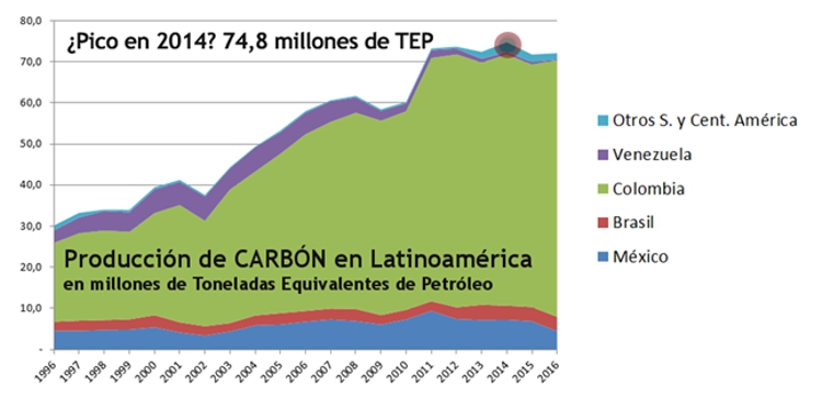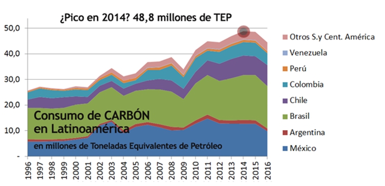 Si bien la producción de carbón tiene un papel secundario en el mix energético de la región (5% del total), su consumo está en descenso a pesar que la producción colombiana de esta sucia fuente de energía haya aumentado. Habrá que ver si se hacen efectivas las intenciones de Trump de incentivar el consumo en EE.UU., nuestro principal comprador, y esto promueve una nueva ronda de inversiones. En cuanto al consumo, la caída (-4,1 MTEP) tiene bastante relación con el aumento de las energías eólica, solar y geo-biomasa (+4,5 MTEP).