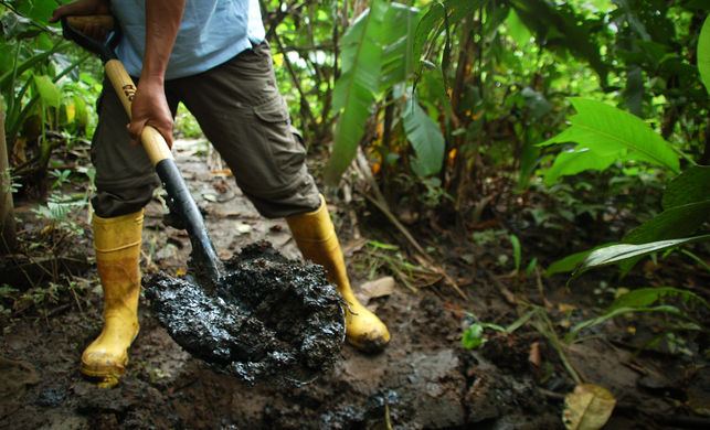 La parroquia rural de San Carlos, ubicada en la provincia amazónica de Orellana, se encuentra dentro del campo Sacha, uno de los más grandes campos petroleros de Ecuador descubierto en 1969 por la trasnacional estadounidense Texaco, adquirida en 2001 por Chevron. En el pozo Sacha 56 todavía se observa la infraestructura del pozo y los cimientos de la casa que la familia Curipoma dejó abandonada. Ermel Chávez, dirigente del Frente de Defensa de la Amazonía, remueve la tierra donde Servio cultivaba sus plátanos. «Aquí, por ejemplo, metes un palo y sale agua y petróleo. Es petróleo y está tapado. Realmente no se sabe qué diámetro tendrá pero siempre hacían piscinas grandes, de hasta tres metros de profundidad y 30 metros de diámetro».