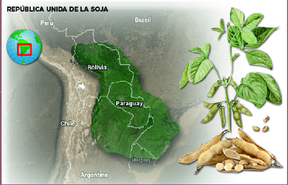 Desde hace algunos años se habla –en realidad es un invento de las trasnacionales- de la República Unificada de la Soja para referirse a la expansión del cultivo de la soja en países como Argentina, Bolivia, Brasil, Paraguay y Uruguay. El 60% de la tierra cultivable en Argentina, un porcentaje similar en el sur de Brasil y casi el 80% en Paraguay ya están sembradas de soja, casi toda transgénica.