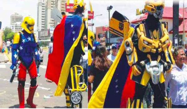 En las movilizaciones de la oposición de los años 2001 y 2002 no era extraño ver banderas de Estados Unidos, personas con disfraces de la estatua de la libertad, etc. Ha pasado década y media desde el golpe de Estado de 2002 y hoy los símbolos que identifican a la clase opositora al chavismo parecen no haber cambiado, más bien asistimos a una sumisión cada vez más abierta a narrativas foráneas, particularmente al imaginario producido por la industria del entretenimiento estadounidense. Más allá de lo tragicómico de la situación, ver en las actuales marchas de la oposición a muchachos disfrazados de “caballeros templarios”, soldados de la Guerra de las Galaxias, Superman, Capitán América o robots transformers, nos muestra cómo el imaginario bélico hegemónico sigue inoculándose con alta efectividad en sectores de la sociedad. Lo trágico del asunto es que estos muchachos están siendo parte de una estrategia de desestabilización violenta que ha armado a grupos civiles e importado paramilitares con el objetivo no sólo de “tumbar a Maduro” sino de aniquilar al chavismo, es decir a la población que desde 1999 viene asumiendo un rol activo en la política y en la vida social del país.