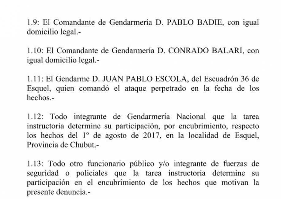 3.1: Está probado por diversos testimonios volcados en la causa judicial en trámite por ante el Juzgado Federal de la localidad de Esquel, provincia de Chubut, que el día 1º de agosto de 2017, SANTIAGO MALDONADO participó de un reclamo en solidaridad con integrantes de la Comunidad Pu Lof en Resistencia de Cushamen, próximo a la Ruta Nacional Nº 40, que de forma severa y brutal fue reprimida por efectivos de Gendarmería Nacional, conforme protocolo y directivas del Ministerio de Seguridad de la Nación, en la que intervinieron más de 30 personas, con empleo de armas de guerra, que invadieron el lugar iniciando una persecución con ribetes de cacería, bajo las consignas de “fuego”, “disparen”, “cacen a uno”, “atrápenlos”, por orden emanada del Juez Federal Dr. GUIDO OTRANTO, que a estar a sus dichos, sólo tenían como directiva despejar la ruta 40. Junto con el personal de Gendarmería Nacional se hallaba el Jefe de Gabinete del Ministerio de Seguridad de la Nación, Dr. PABLO NOCETI. Grabaciones propaladas por los medios audio-visuales acreditan que los pocos integrantes de la Comunidad Mapuche que se encontraban en el lugar no estaban cortando la Ruta Nacional Nº 40, sino que estaban apostados en terrenos linderos a dicha ruta. No obstante ello, como fuere dicho, el grupo de gendarmes cargó con sus armas de fuego y pronunciando directivas descalificantes respecto de los integrantes de la Comunidad Mapuche, abrieron fuego sobre los escasos manifestantes, desatando una virtual caza, totalmente injustificable ya que no mediaba corte alguno y de haberlo, podían ser dispersados sin empleo de armas de fuego –armas de guerra- cuyo uso presupone siempre un peligro para la vida y la integridad de las personas. La estampida de los Mapuches ante este ataque brutal e indiscriminado, llevó a correr hacia un río cercano. SANTIAGO MALDONADO corrió también con ellos y se refugió en arbustos linderos al río, pero no lo cruzó, se presume que por no saber nadar y desconocer también que era un río, en ese paraje, no muy profundo ni correntoso.-