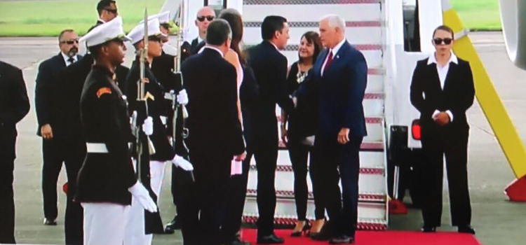 El vicepresidente estadounidense aterrizó en el Aeropuerto Internacional de Tocumen a las 12:50 p.m, acompañado por su esposa, Karen Pence, y fue recibido por el vicecanciller, Luis Miguel Hincapié; el embajador de Estados Unidos en Panamá, John Feeley, y el embajador de Panamá en Estados Unidos, Emanuel González Revilla.