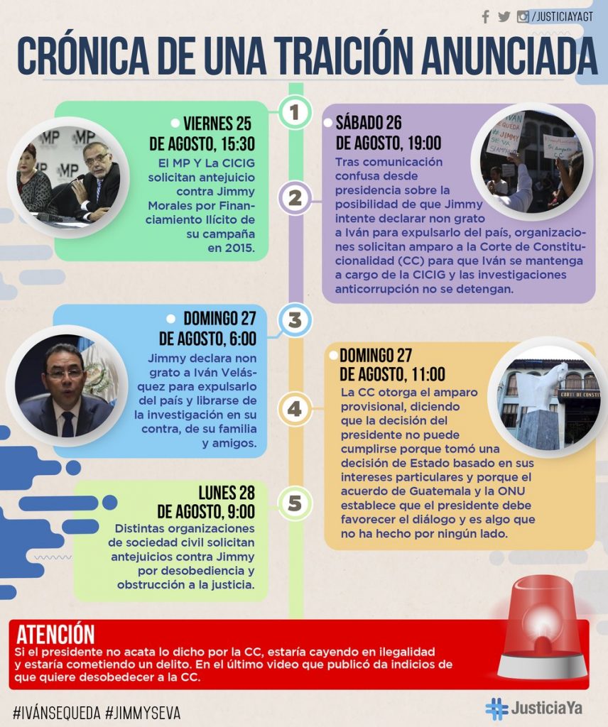 La crisis involucra un enfrentamiento del mandatario con la titular del Ministerio Público (MP), Thelma Aldana, y el exmagistrado colombiano Iván Velásquez, jefe de la Comisión Internacional Contra la Impunidad en Guatemala (CICIG).