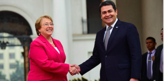Honduras y Chile firman convenios para fortalecer área minera y comercial “Esta ha sido una visita muy fructífera, muy provechosa”, así resumió la presidenta de Chile, Michelle Bachelet Jeria, su estadía de 24 horas en Honduras en la que estrechó con éxito lazos comerciales y de cooperación. El miércoles, previo a finalizar su vista, tuvo un encuentro de cuatro horas … Sigue leyendo Bachelet y Hernández firman acuerdos y debaten ingreso de Honduras a Alianza del Pacífico