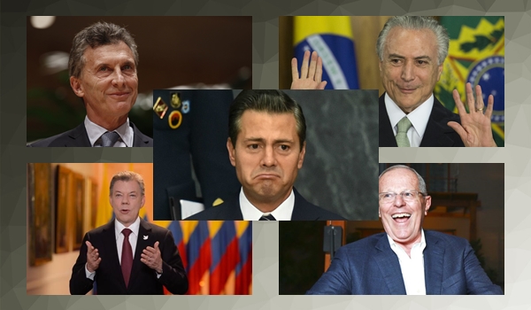 Temer sigue siendo presidente de Brasil sin un voto en las urnas. Macri, el de los Panamá Papers, tiene a Milagro Salas en una cárcel argentina como presa política. Santos está involucrado en el escándalo de Odebrecht porque habría recibido un millón de dólares para su campaña presidencial en Colombia en 2014. En lo que va de gestión de Peña Nieto, han sido asesinados 36 periodistas en México, por realizar su labor informativa. El año pasado Kuczynski gobernó Perú con 112 decretos evitando así tener que transitar por el poder legislativo.